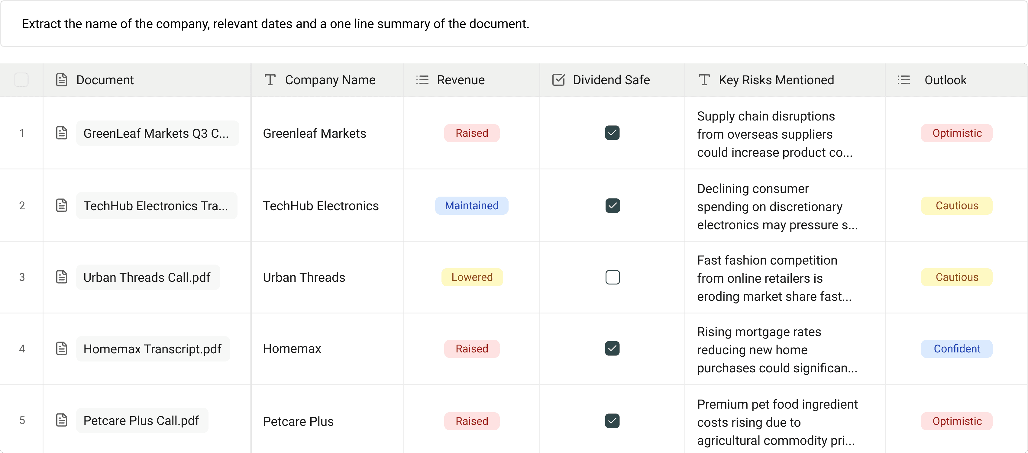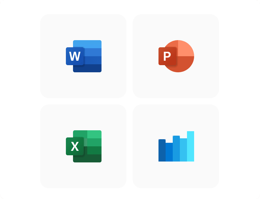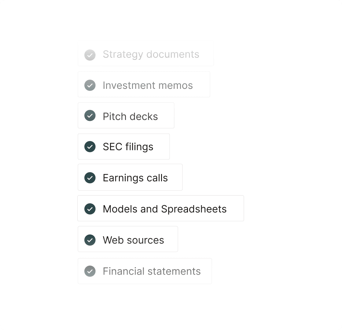 Turn analysis into polished outputs — memos, tables, decks, and charts — all compatible with your existing tools.
